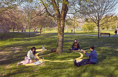 英國設(shè)計(jì)師Paul Cocksedge也表示,在與新冠疫情抗擊的當(dāng)下,人們需要想出與病毒共生的辦法。雖然專家建議大家保持兩米的距離社交,但普通民眾對這種距離是沒有概念的。因此,他發(fā)明了這款圓圈地毯,以直觀的形式把人們以兩米的距離隔開。