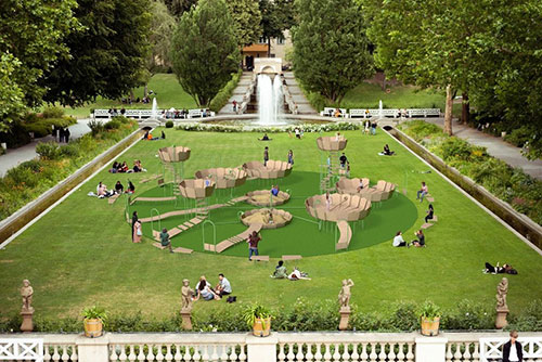 在這里,每個(gè)孩子可以擁有自己的游戲平臺,通過單獨(dú)的路徑進(jìn)入后,他們可以從安全距離里看到彼此,并通過空心管交流,有沒有很神奇!游玩平臺可容納不同類型的活動(dòng)和游戲,一些包含沙子,而另一些內(nèi)部裝有蹺蹺板、梯子等...