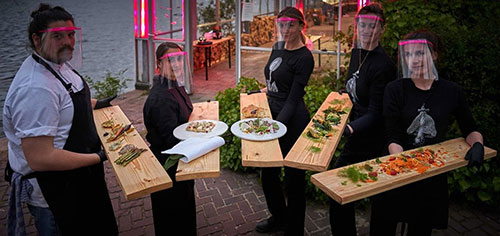我們希望人們?nèi)匀豢梢园踩匾黄鸪燥埡凸蚕硪活D飯,” Median Eten的廚師吉利亞·索拉蒂說,所有空間都是分開的,但人們?nèi)匀豢梢怨蚕砜臻g并共享食物。我們將永遠(yuǎn)在外面,所以這將是安全的。我們將戴著手套和防毒面具。