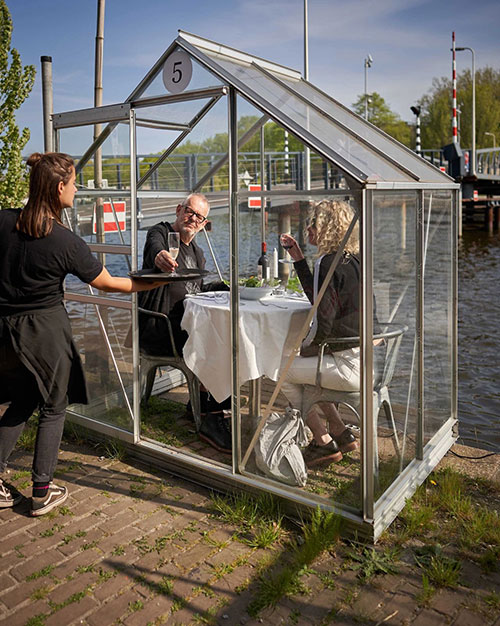在這個(gè)獨(dú)立且私密的隔離式溫室,人們可以在安全的環(huán)境下重聚并戶外用餐。盡管溫室是全透明的,但是它被命名為 “Chambre séparée”,暗示著用餐者的親密關(guān)系。