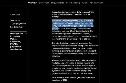 IDE這個專業(yè)對于申請者的要求較高,不單單需要你有藝術(shù)設(shè)計的功底,更看重的是你的綜合能力,包括藝術(shù)設(shè)計、科學(xué)技術(shù)、工程技術(shù)等等各方面。當(dāng)然這個專業(yè)的培養(yǎng)目標(biāo)也是綜合人才,在官網(wǎng)給出的專業(yè)介紹中我們也可以了解到IDE的課程既結(jié)合了皇藝的藝術(shù)設(shè)計思維,同時又不失帝國理工的嚴(yán)謹(jǐn)和科學(xué)。