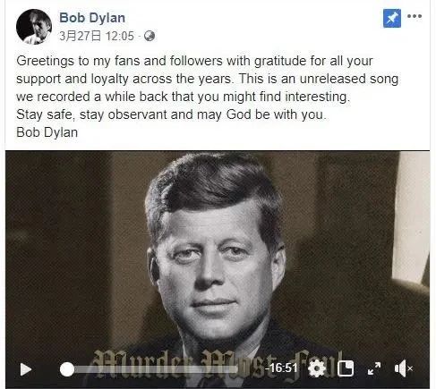 327日鮑勃·迪倫突然發(fā)布一首1654秒的新歌《Murder Most Foul》(《最卑鄙的謀殺》),他同時配文寫道:問候我的歌迷和粉絲們,感謝你們多年來的真誠相伴。這是一首我們錄了好一陣子的歌曲,或許你們會覺得有趣。