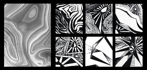 導師帶領小組討論、評出最佳作品,進行深化并探討其可重復性。可對單一Tile進行旋轉(zhuǎn)或者鏡面(所用軟件:Photoshop)。最后將六個Tile拼接在一起(7cm X 7cm)* 6。HW:完成Tile拼接并打印出來。